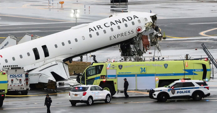 US police reported on Monday that an Air Canada aircraft collided with a fire truck on a runway at New York’s LaGuardia airport, killing two pilots and injuring dozens more.